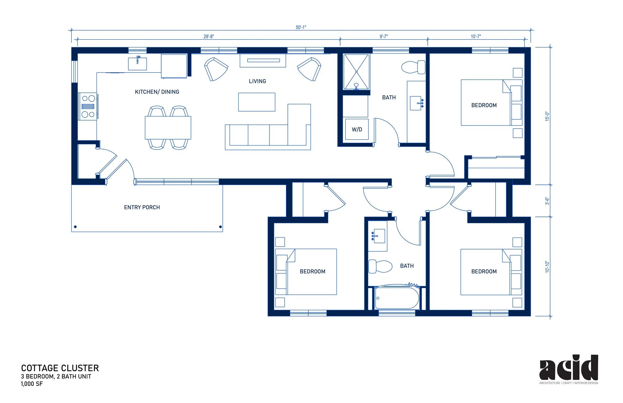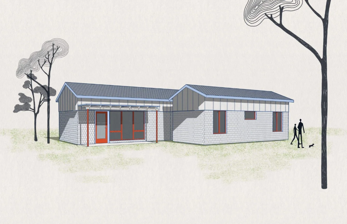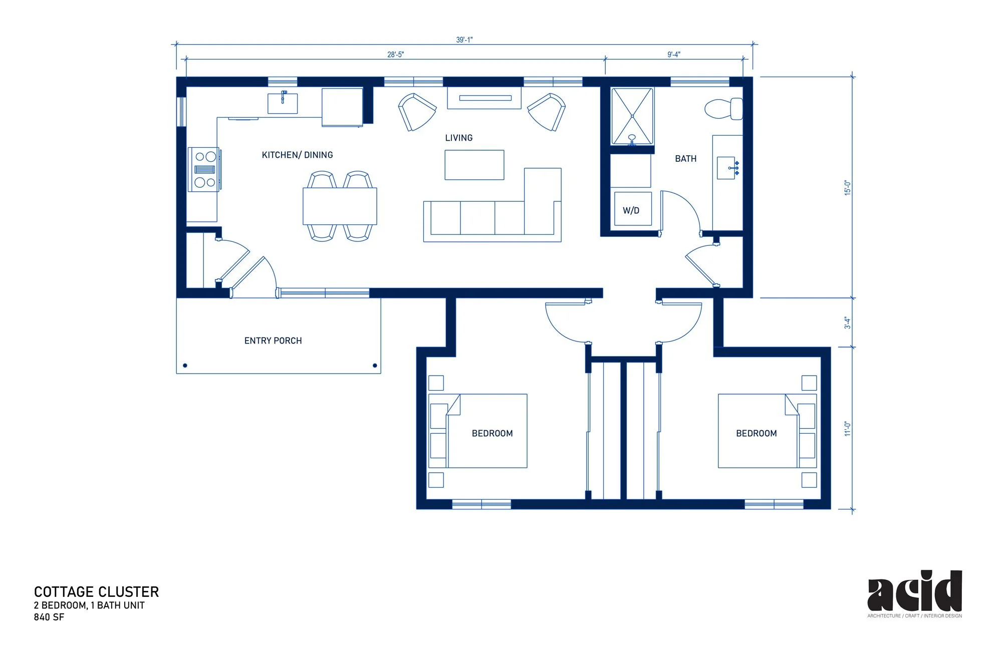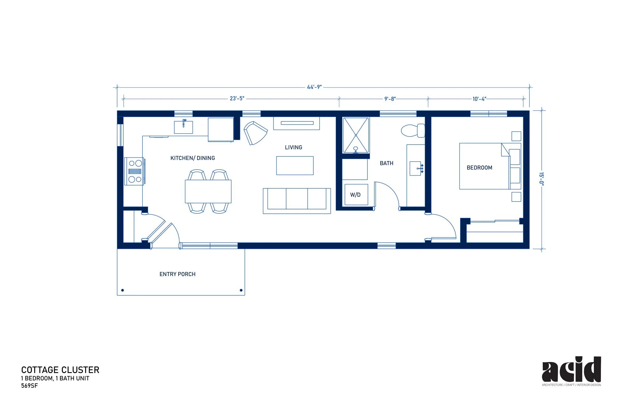 ACID’s cottage cluster design incorporates features that are often not found in modular construction, including steeper-pitched roofs, eave overhangs, a defined private outdoor space, and a charming material palette that celebrates craft and originality.