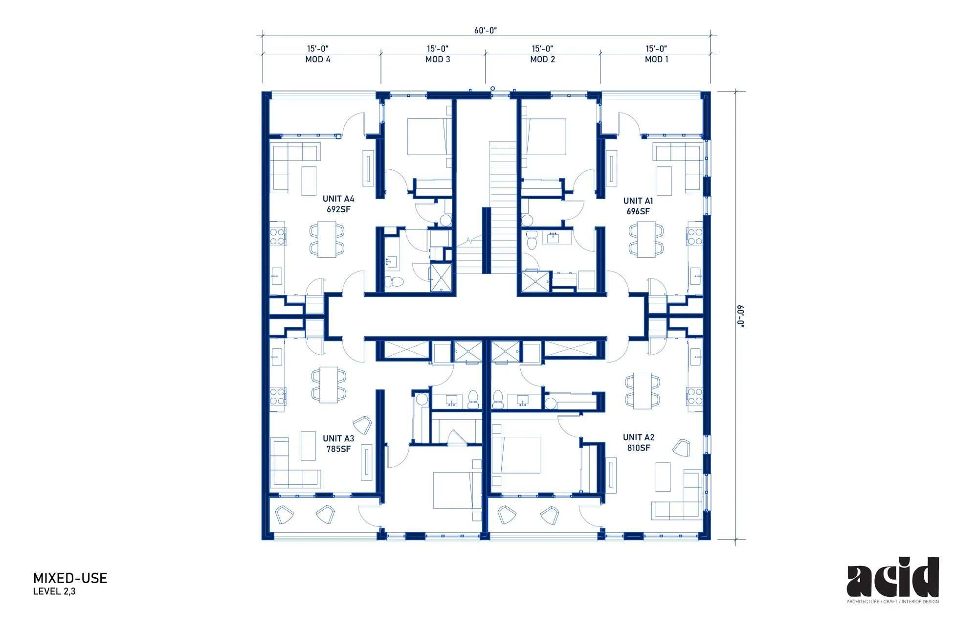 Four-story modular apartment complex that features chase walls built into the modules. The design reduces site work and streamlines utility connections for faster project delivery. Circulation corridors are also constructed in the factory, ensuring precise quality control and minimizing on-site construction time. With Type A accessibility integrated throughout, this apartment supports inclusive living for all residents.